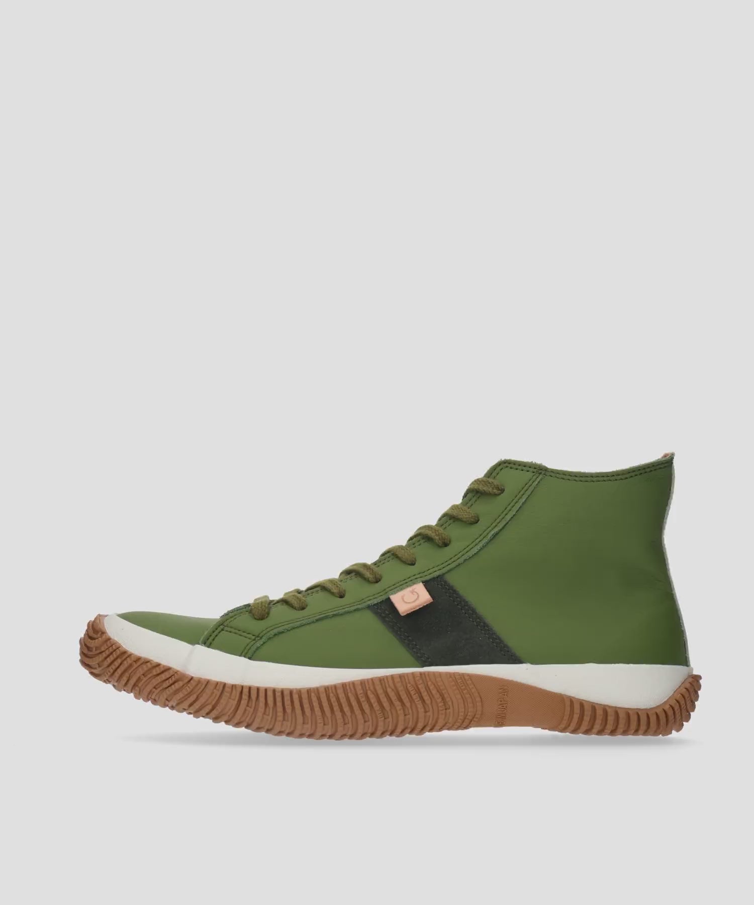 This matcha leather high-cut model shoe was developed in collaboration with "Morihan", a long-established tea shop in Uji, Kyoto.This sustainable Japan Beauty model breathes new life into waste materials that would otherwise be discarded by reusing the residue produced during the matcha manufacturing process for leather tanning. The upper features matcha leather that highlights the natural depth of matcha. Dark green suede and white leather on the heel accentuate the deep color of matcha, adding an elegant accent. The NR sole from RUBEAR improves elasticity and wear resistance while maintaining the softness and flexibility of natural rubber. This shoe combines tradition and innovation to suit the modern lifestyle.